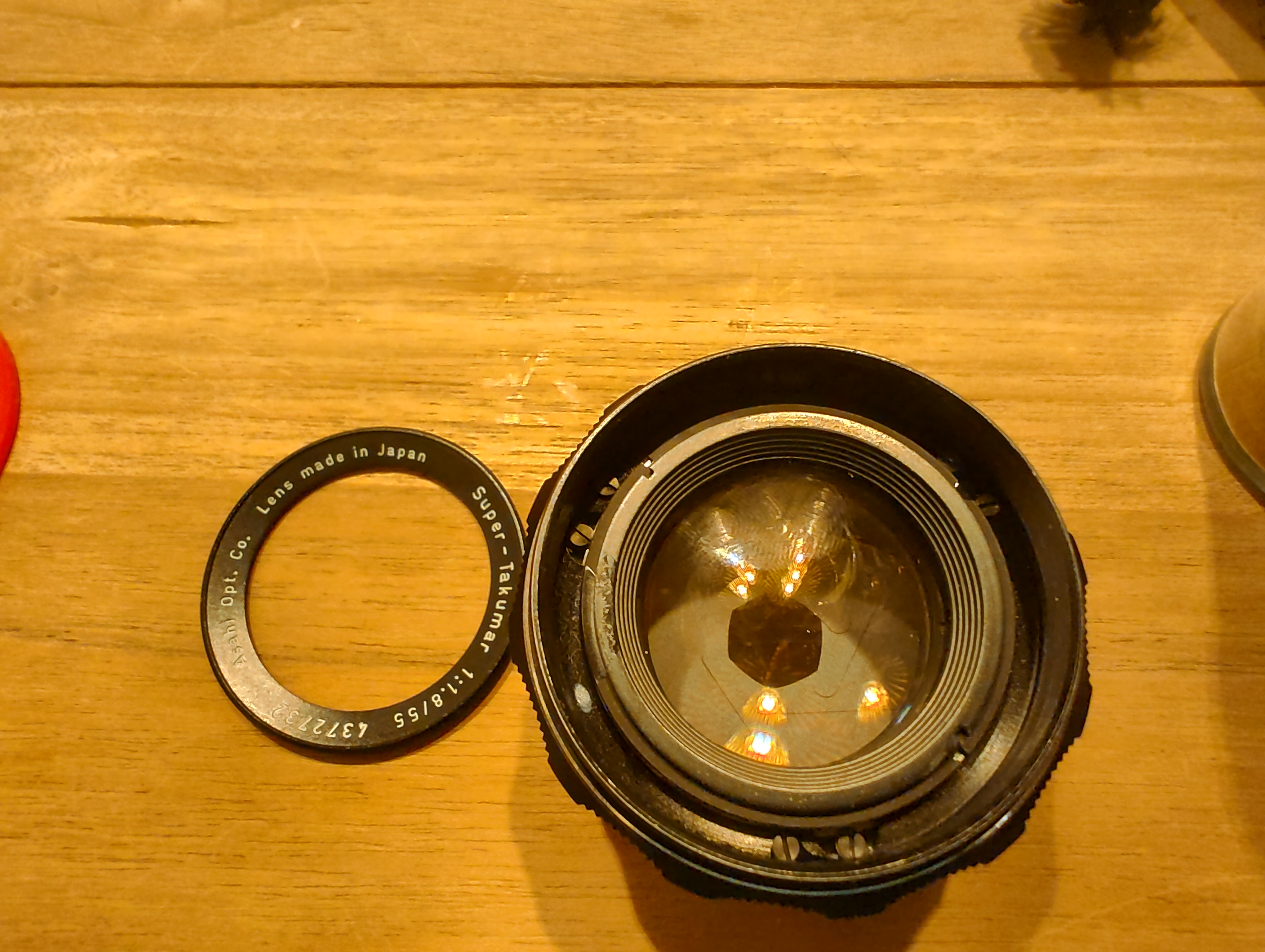 The flange focal distance on my nikon D3400 is 46.5mm. For an M42 lens this is 45.46mm. That, plus the adapter ring with a thickness of about 1mm means there is about a 2mm difference to focus this lens. When using a Canon camera with an EF mount, this is not an issue, since it has a flange focus distance of 44mm. For the nikon though this means you lose the ability to focus on infinity, and can only focus abount 2-3m from the lens. To compensate for this I tried advice from mflenses.com forum posts and manually moved the lens assembly backward a bit.